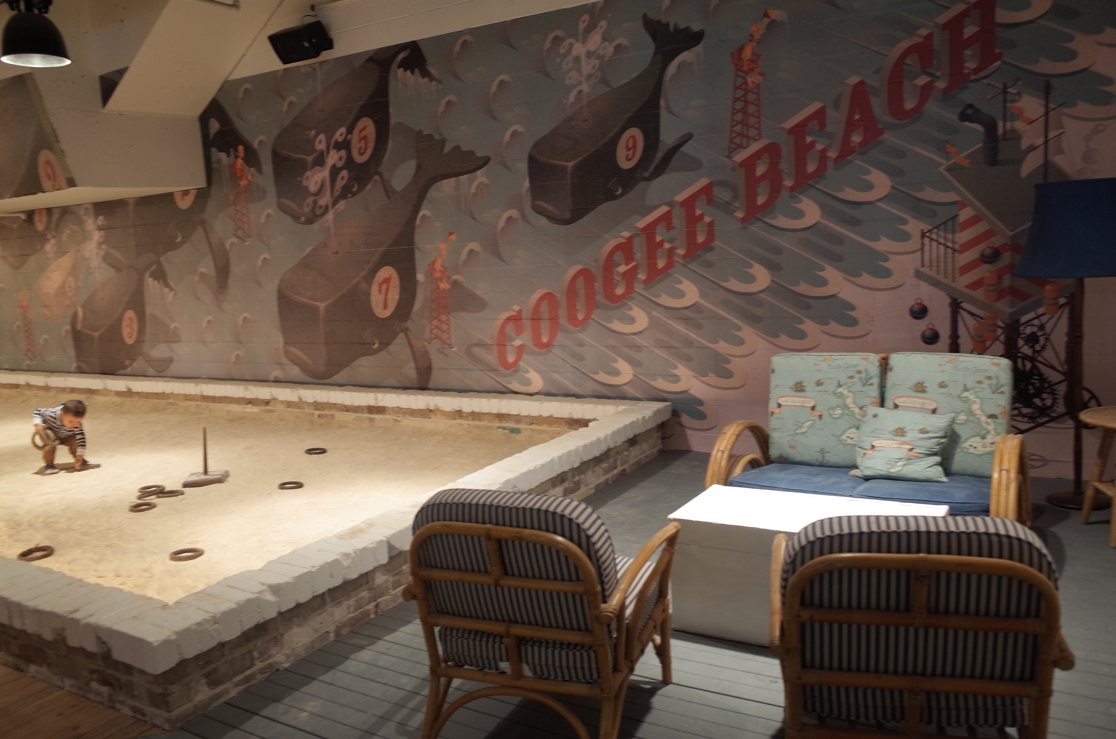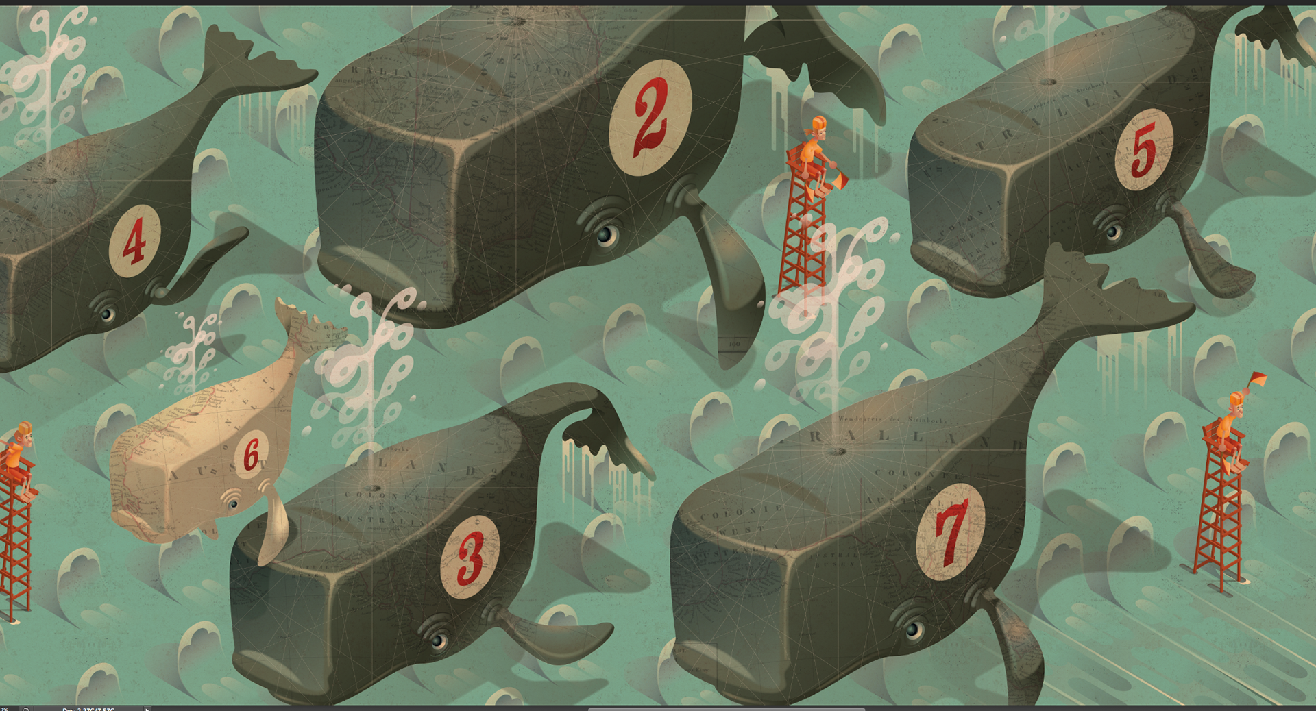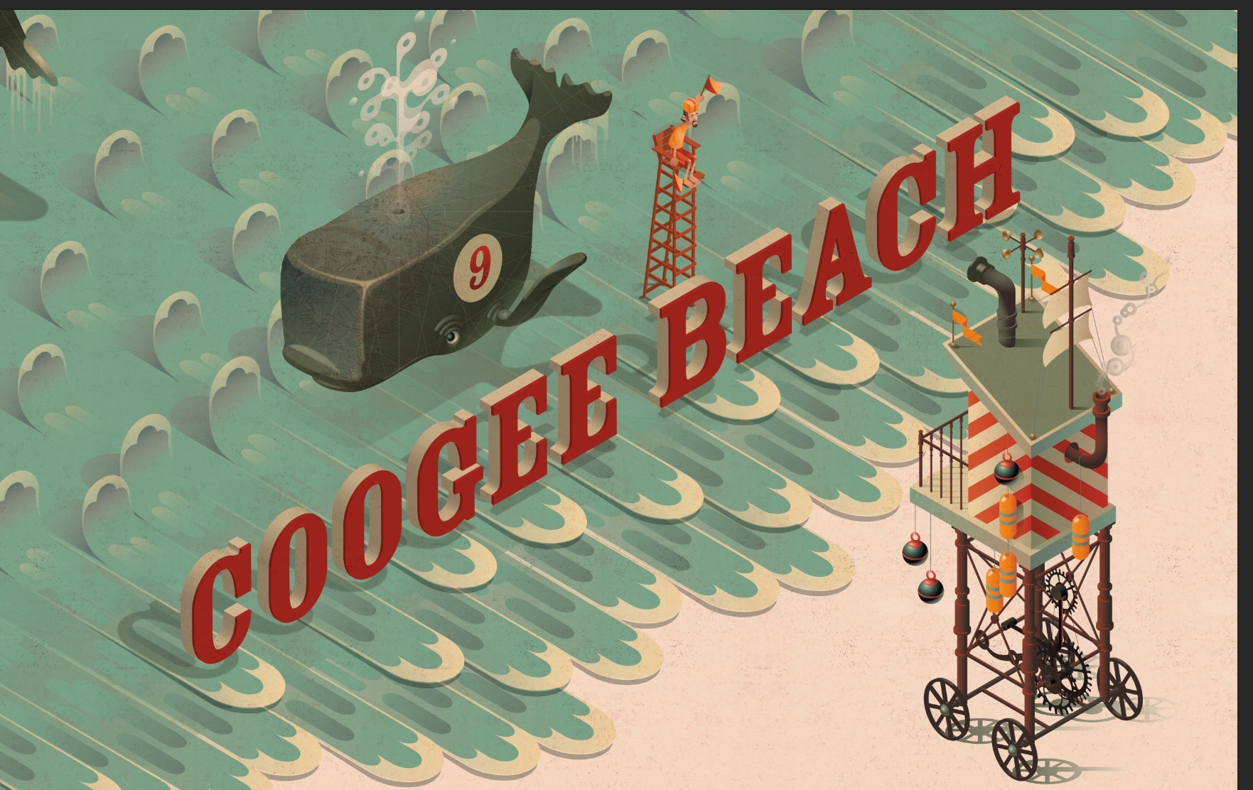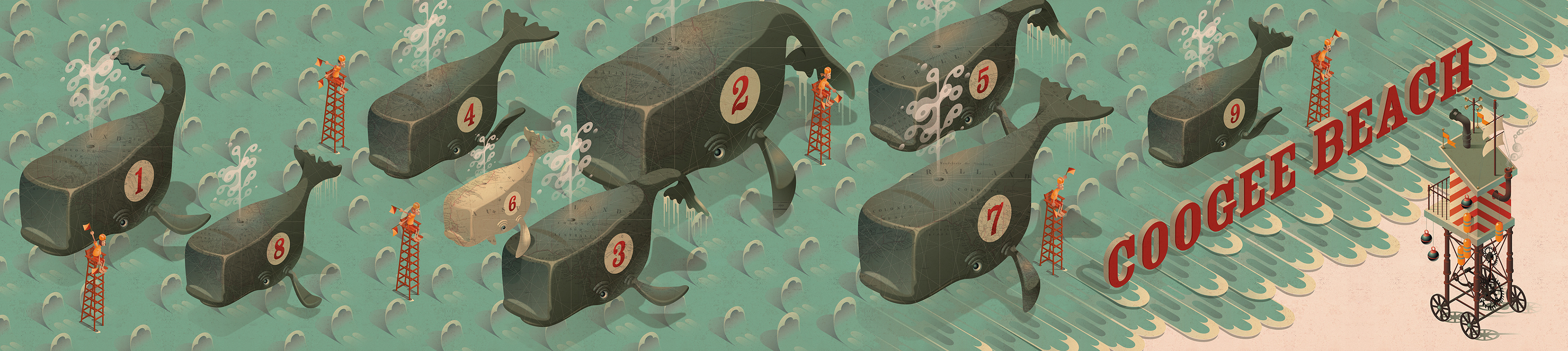 This illustration was commissioned to be foil painted onto a 15 metre wall in the games area of the wonderful Coogee Pavilion on Sydney's Coogee Beach, a good place to spot whales.