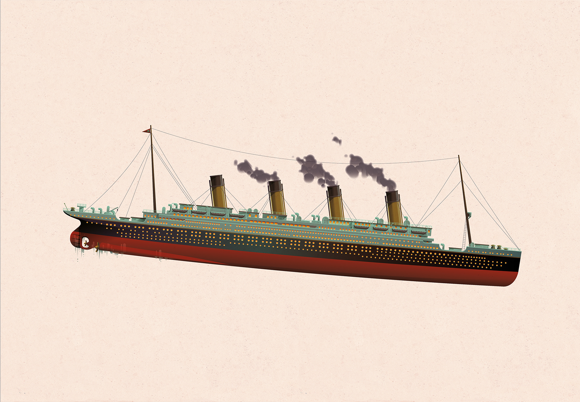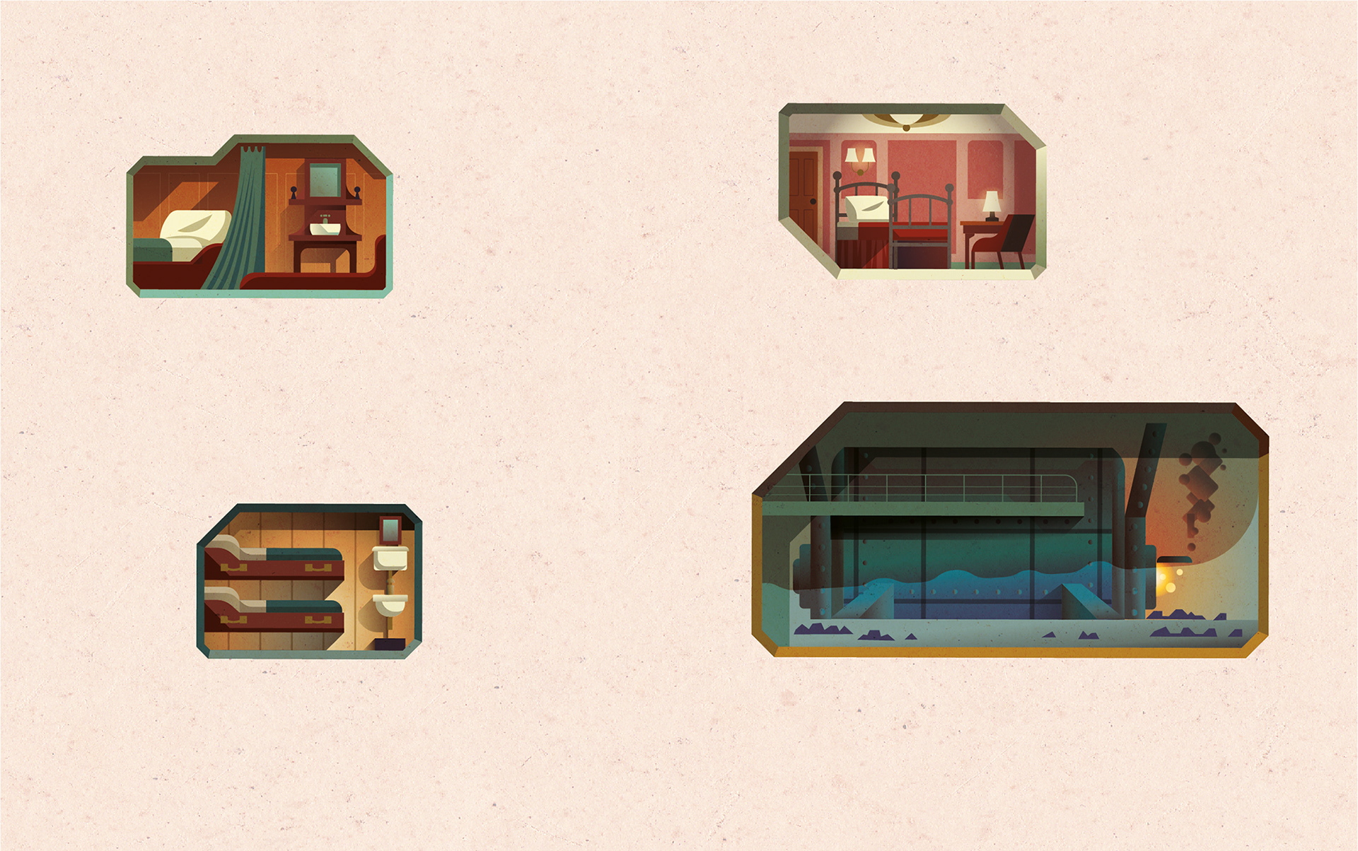 Illustrations of the Titanic for Scholastic US with cutaway details of 1st, 2nd, 3rd class cabins and a boiler room.